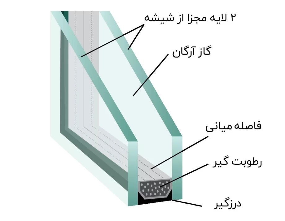 شیشههای دوجداره با ساختاری پیچیده و دقیق، به عنوان یک راهکار عایقبندی در برابر حرارت و صدا عمل میکنند. این شیشهها از دو لایه مجزا تشکیل شدهاند که بین آنها یک فاصله میانی قرار دارد. این فضای بین دو لایه شیشه با گاز آرگون پر شده است که به دلیل ویژگیهای عایقبندی بالا، در کاهش انتقال حرارت بسیار مؤثر است. در اطراف لبههای شیشه، رطوبتگیر قرار دارد که وظیفه جذب رطوبت موجود در هوای بین دو لایه شیشه را دارد. این کار از تشکیل بخار و کدر شدن شیشه جلوگیری میکند و دید شفاف را حفظ مینماید. همچنین، درزگیر به کار رفته در اطراف شیشه، از ورود هوا، گرد و غبار و رطوبت به فضای بین دو لایه شیشه جلوگیری میکند و اطمینان حاصل میکند که عملکرد عایقبندی شیشهها در طول زمان حفظ شود. این ساختار منحصربهفرد، شیشههای دوجداره را به یک انتخاب ایدهآل برای بهبود کارایی انرژی و افزایش راحتی در فضاهای مسکونی و تجاری تبدیل میکند. با توجه به مزایایی که این شیشهها ارائه میدهند، سرمایهگذاری در آنها به مرور زمان به صرفه و مقرونبهصرفه خواهد بود.