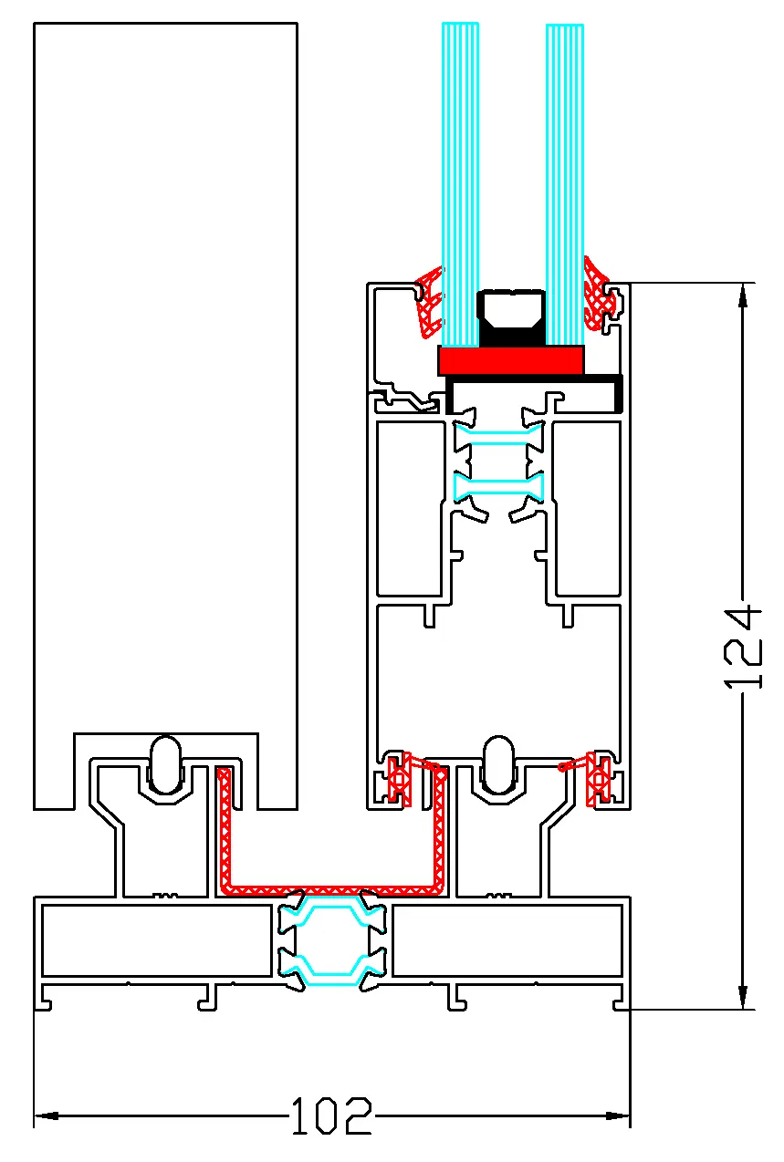 پهنای قاب 102 میلیمترپهنای بازشو 45 میلیمترضخامت دیواره 1.5 میلیمترپهنای تیغه پلی آمید 18 میلیمترضخامت شیشه 24 - 30 میلیمترارتفاع قابل رویت 124 میلیمترانواع بازشوهای پنجره قابل اجرا