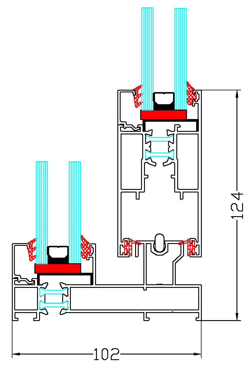 پهنای قاب 102 میلیمترپهنای بازشو 45 میلیمترضخامت دیواره 1.7 میلیمترپهنای تیغه پلی آمید 18 میلیمترضخامت شیشه 20 - 30 میلیمترارتفاع قابل رویت 124 میلیمترانواع بازشوهای پنجره قابل اجرا
