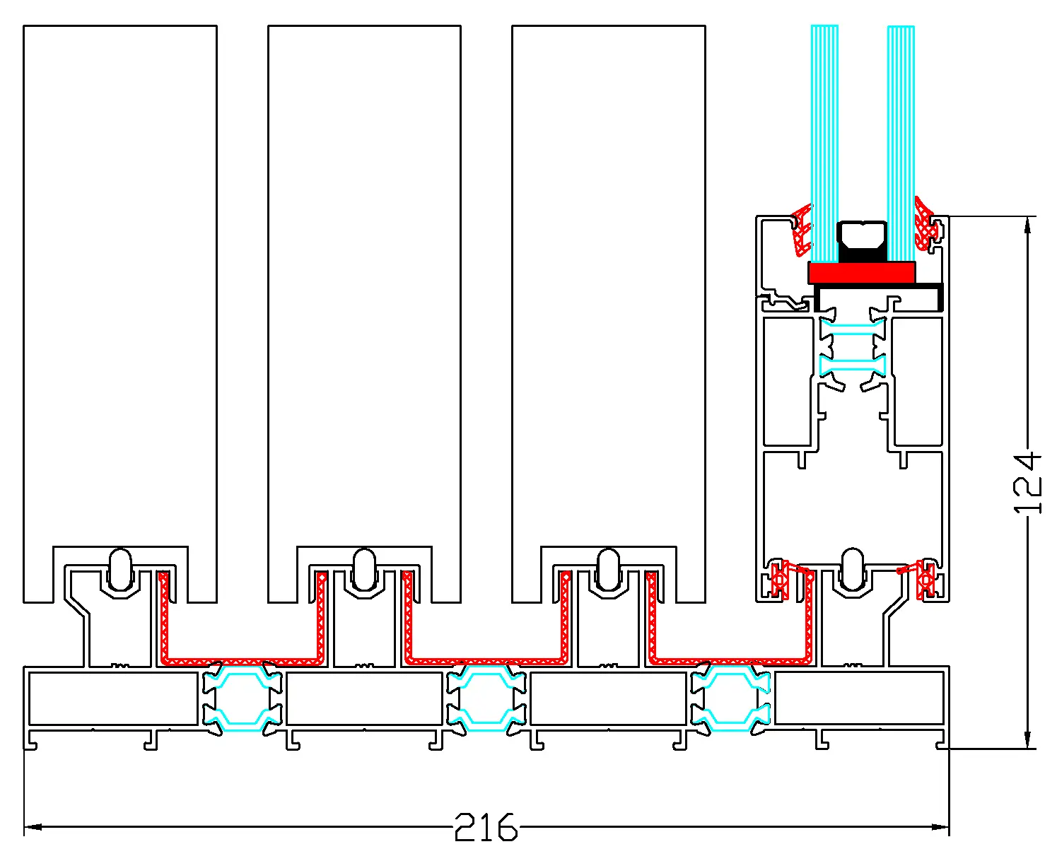 پهنای قاب 216 میلیمترپهنای بازشو 45 میلیمترضخامت دیواره 1.7 میلیمترپهنای تیغه پلی آمید 18 میلیمترضخامت شیشه 20 - 30 میلیمترارتفاع قابل رویت 124 میلیمترانواع بازشوهای پنجره قابل اجرا