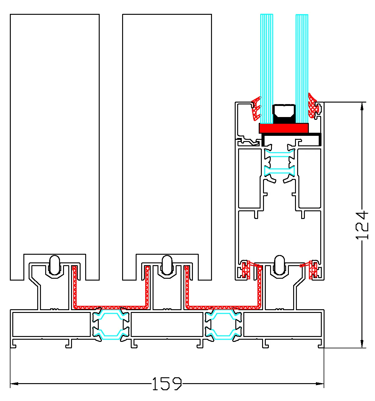 پهنای قاب 159 میلیمترپهنای بازشو 45 میلیمترضخامت دیواره 1.7 میلیمترپهنای تیغه پلی آمید 18 میلیمترضخامت شیشه 20 - 30 میلیمترارتفاع قابل رویت 124 میلیمترانواع بازشوهای پنجره قابل اجرا