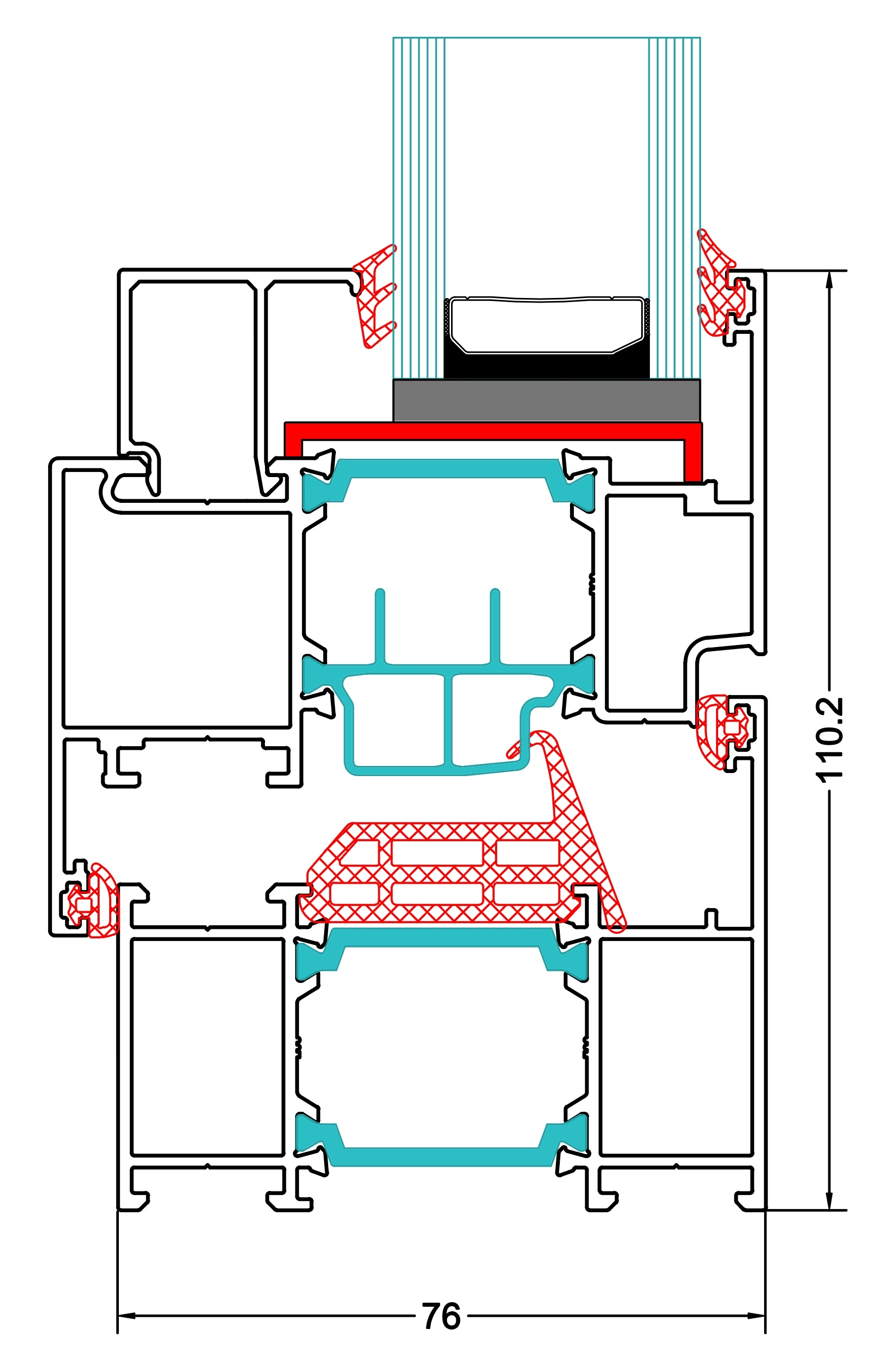 پهنای قاب 76 میلیمترپهنای بازشو 84 میلیمترضخامت دیواره 1.6 میلیمترپهنای تیغه پلی آمید 34 میلیمترمحدوده ضخامت شیشه 22 تا 46 میلیمترارتفاع قابل رویت 110 میلیمترانواع بازشوهای پنجره قابل اجرا