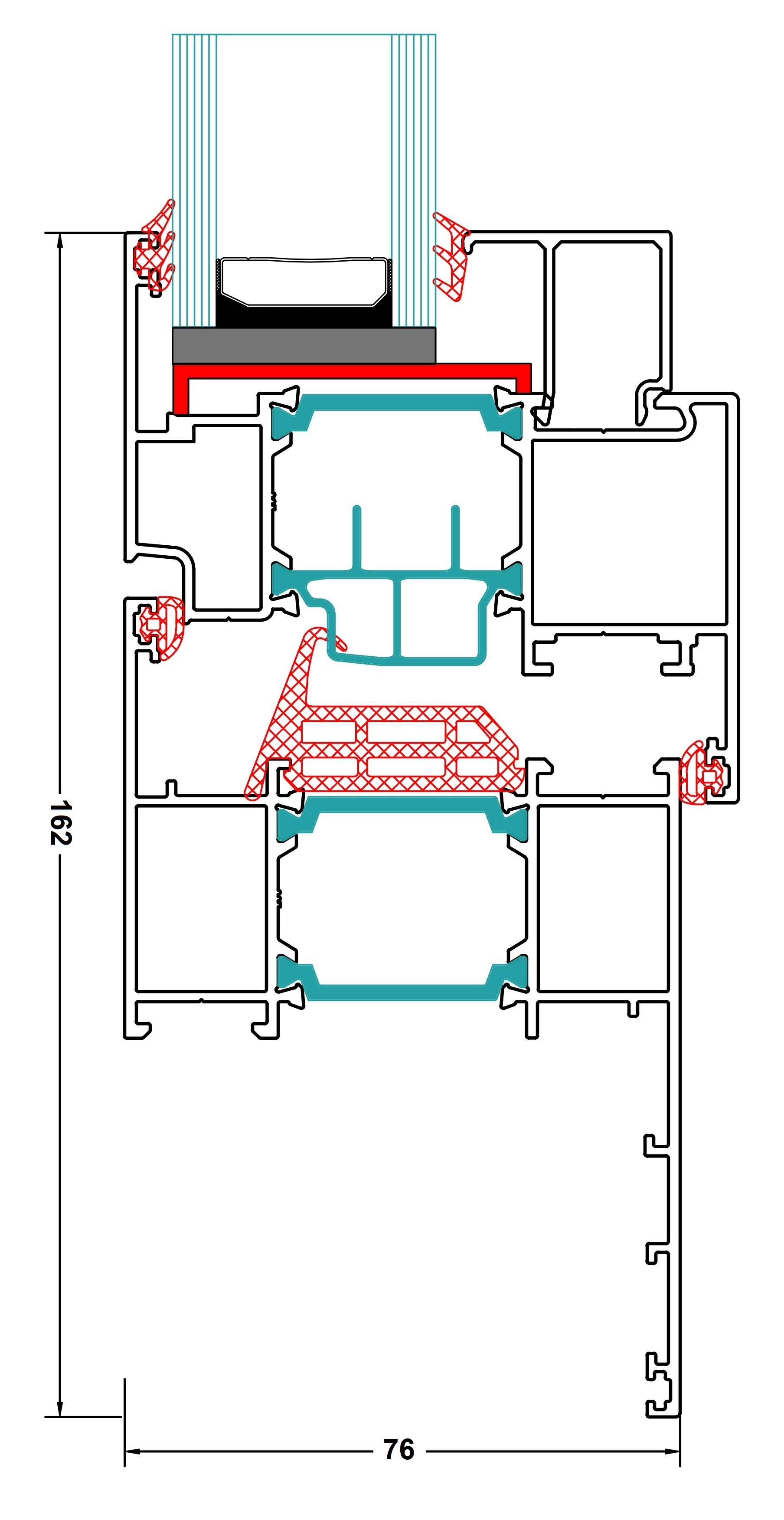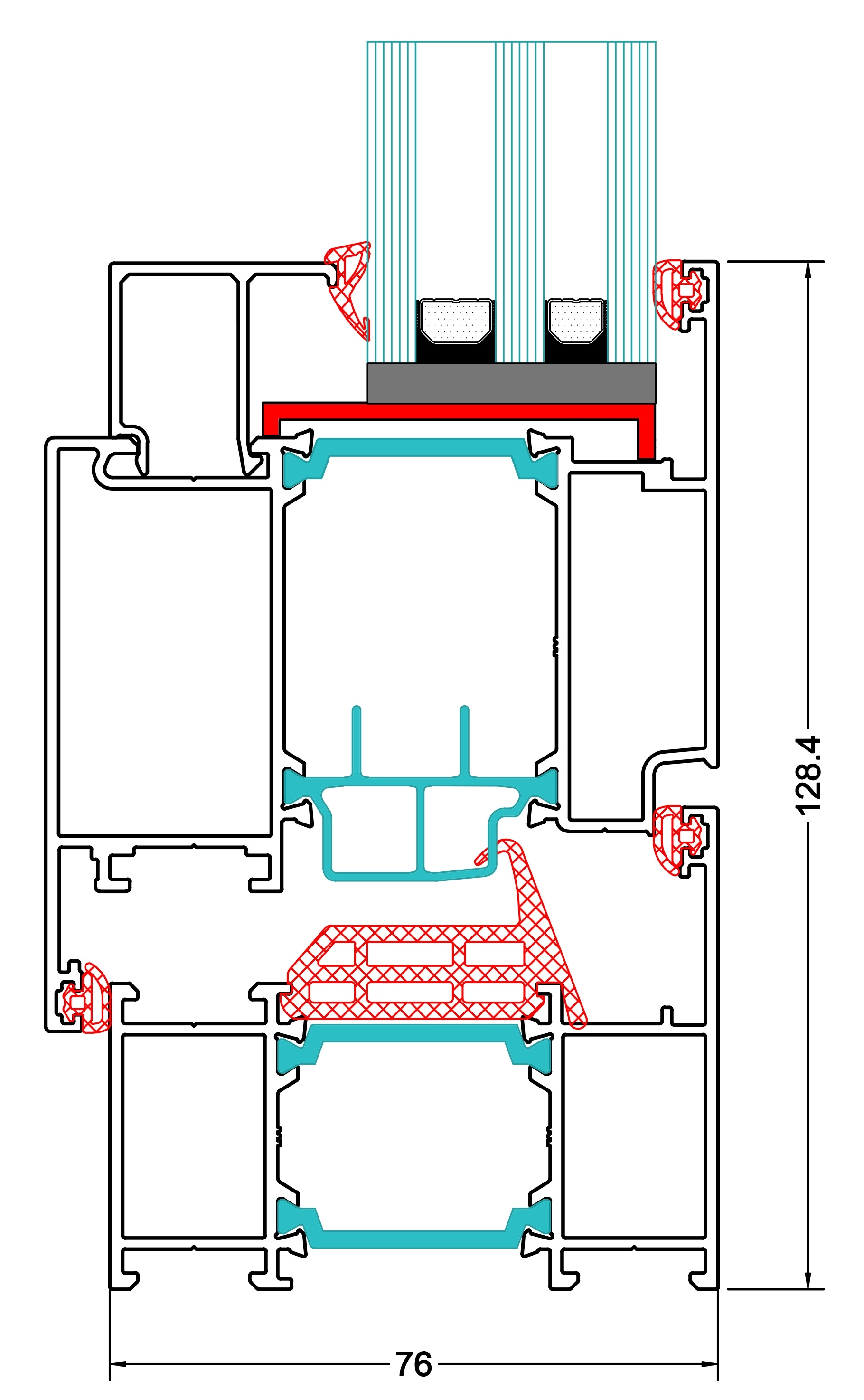 پهنای قاب 76 میلیمترپهنای بازشو 84 میلیمترضخامت دیواره 1.6 میلیمترپهنای تیغه پلی آمید 34 میلیمترمحدوده ضخامت شیشه 22 تا 46 میلیمترارتفاع قابل رویت 128 میلیمترانواع بازشوهای درب قابل اجرا