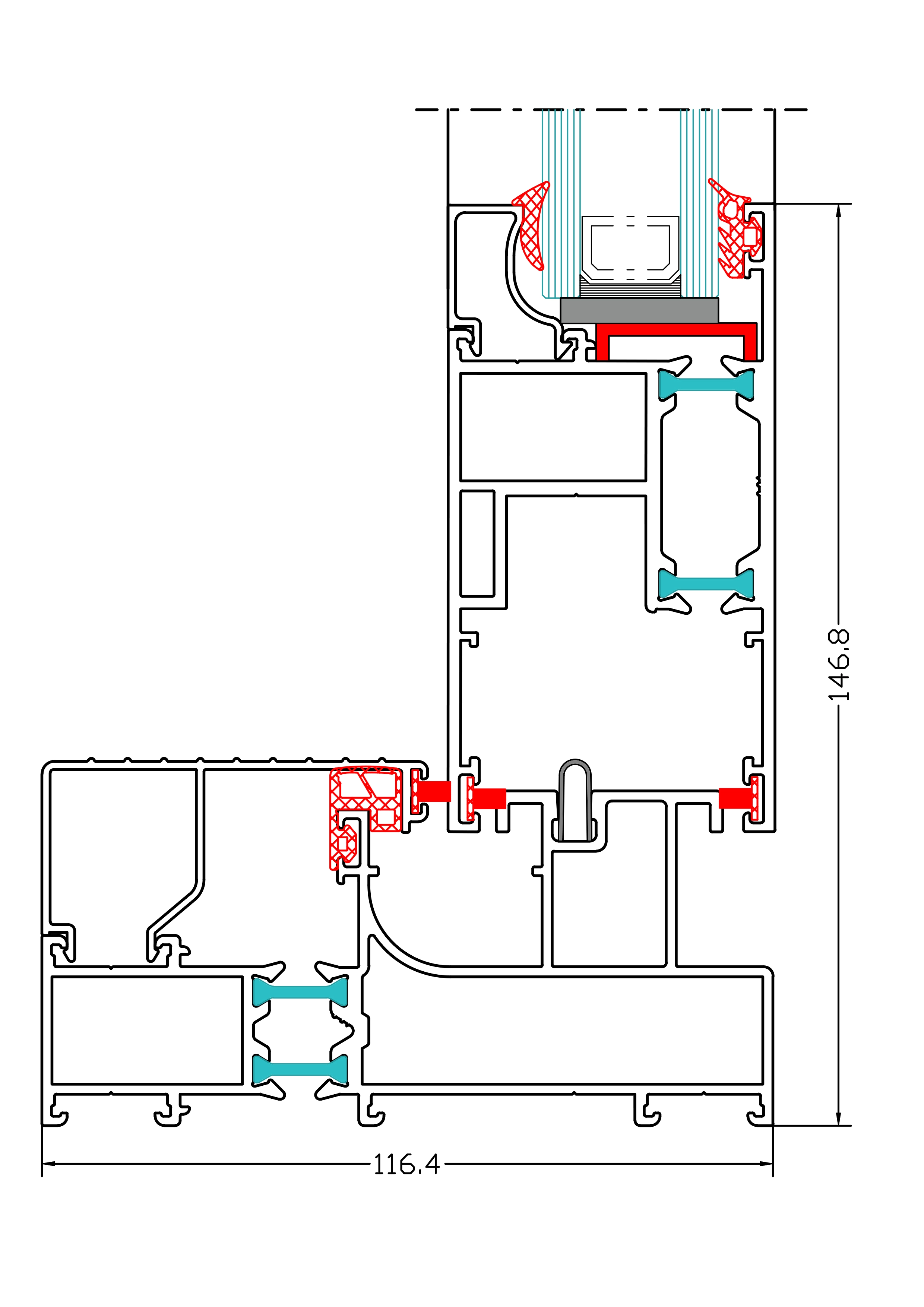 پهنای قاب 116 میلیمترپهنای بازشو 52 میلیمترضخامت دیواره 1.6 - 1.8 - 2 میلیمترپهنای تیغه پلی آمید 15 میلیمترضخامت شیشه 20 - 24 - 28 میلیمترارتفاع قابل رویت 146.8 میلیمترانواع بازشوهای پنجره قابل اجرا