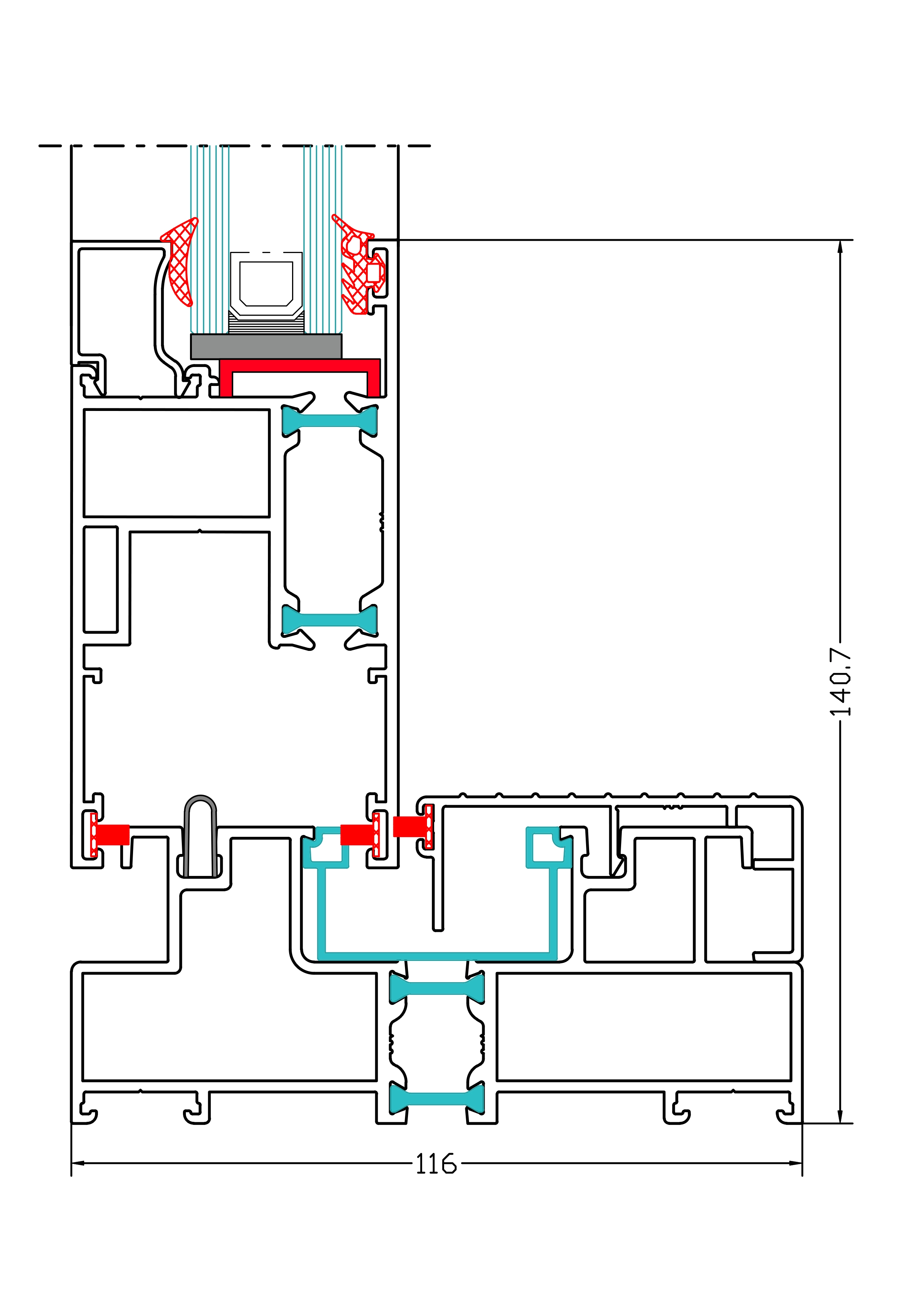 پهنای قاب 116 میلیمترپهنای بازشو 52 میلیمترضخامت دیواره 1.6 - 1.8 - 2 میلیمترپهنای تیغه پلی آمید 15 میلیمترضخامت شیشه 20 - 24 - 28 میلیمترارتفاع قابل رویت 140.7 میلیمترانواع بازشوهای پنجره قابل اجرا